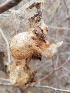 Following Dick's advice, I put them back in their damaged sac, back on their plum branch, to continue their march toward adulthood. Here they are, back outside: